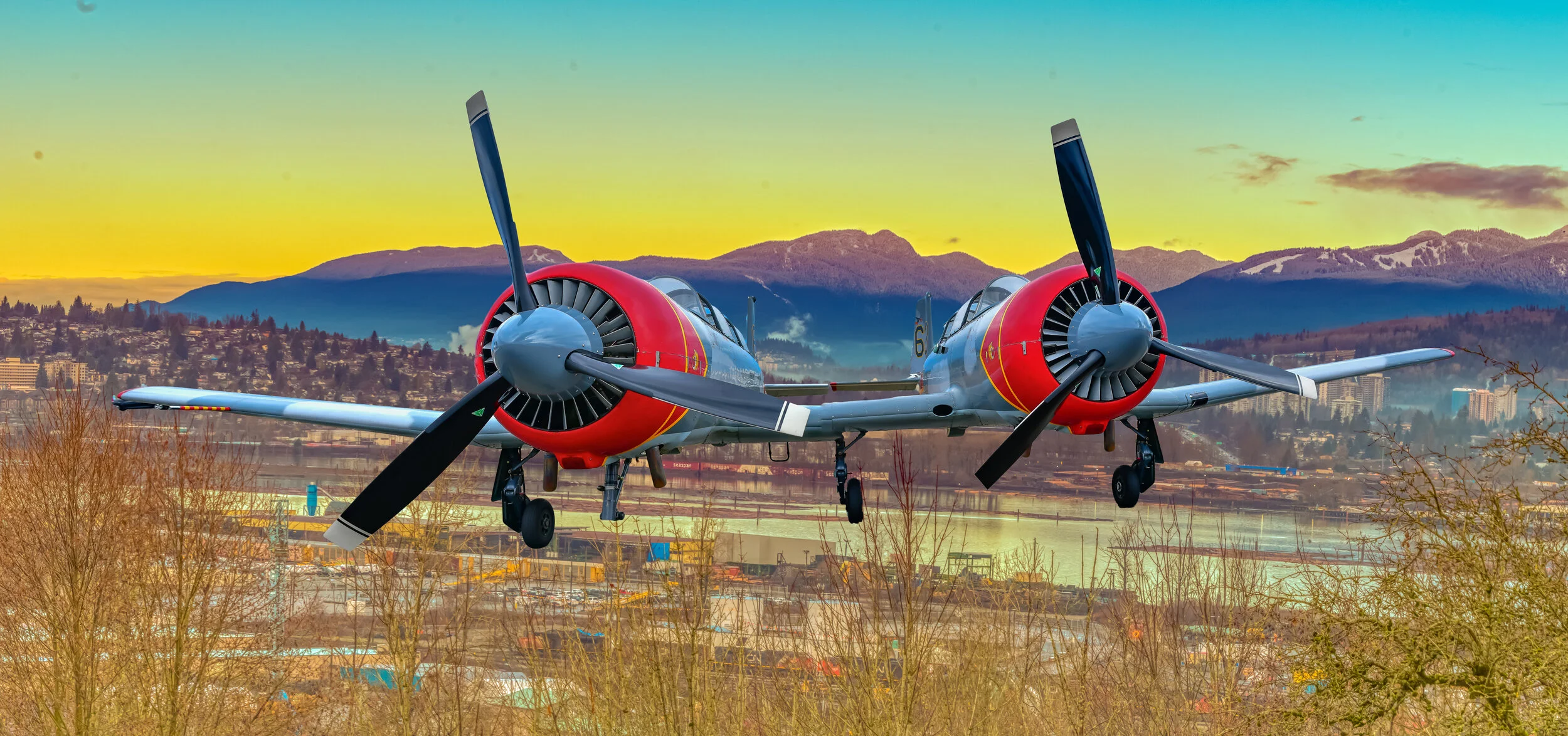 TWIN YAK ABOUT TO LAND IN THE VALLEY DURING SUNSET GOLDEN HOUR